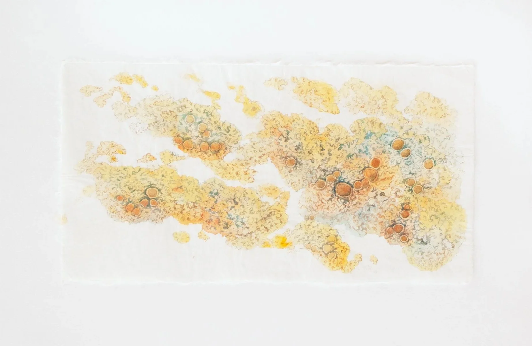 Lichens spread and layer slowly in processes of forming crusts, powders, lobes and scales. Never a complete expression of form like the bloom of a flower, lichens are always in a process of formation – passing through form and formlessness. A flower’s bloom, decorative and short-lived, contrasts with lichens’ ongoing temporality, resisting figuration.